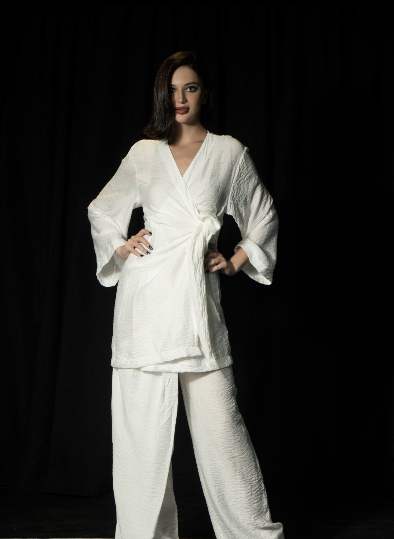بلوزة من الكتان الأبيض بأكمام طويلة | بنطلون طويل مع قص نصف تنورة.