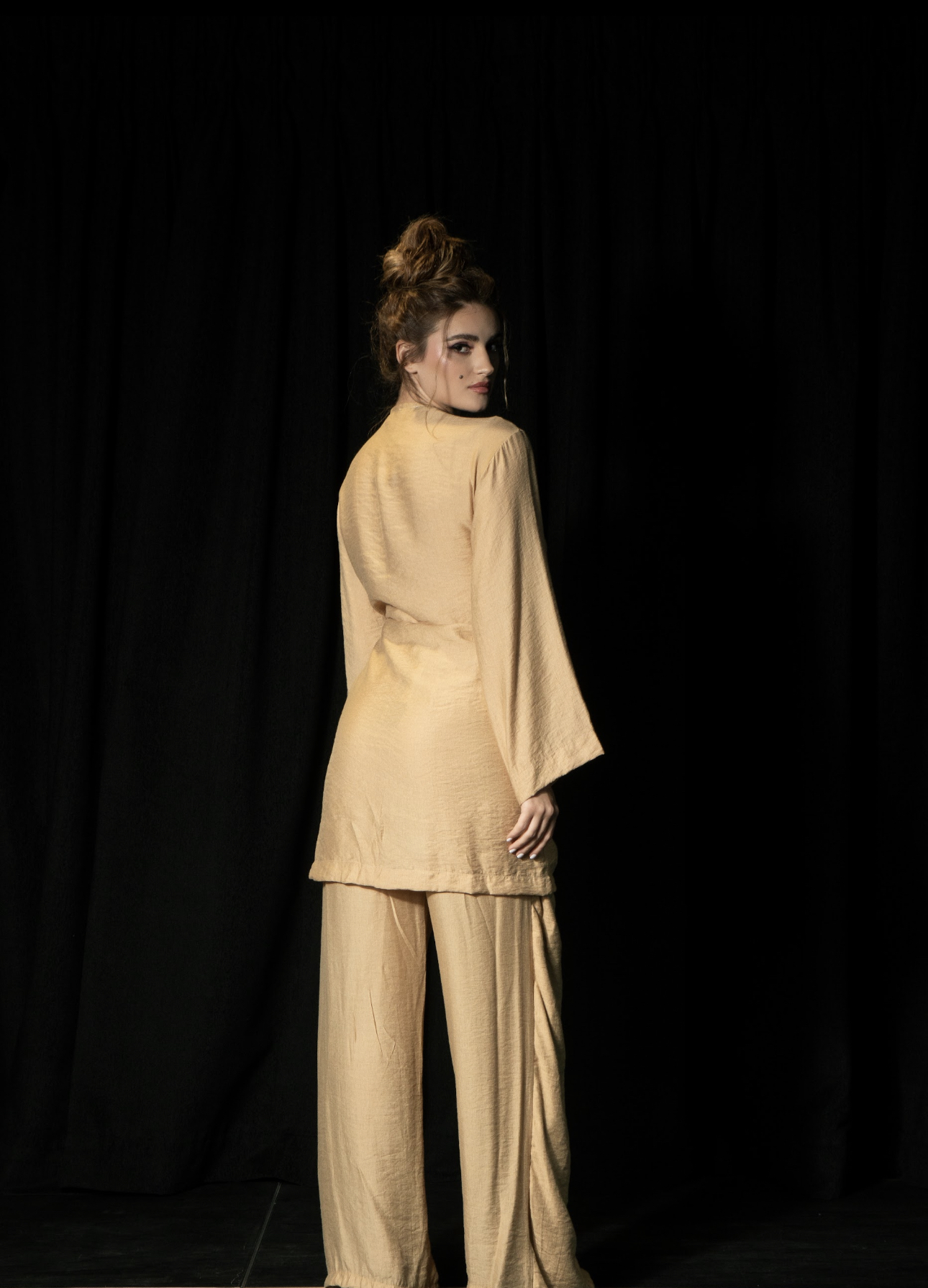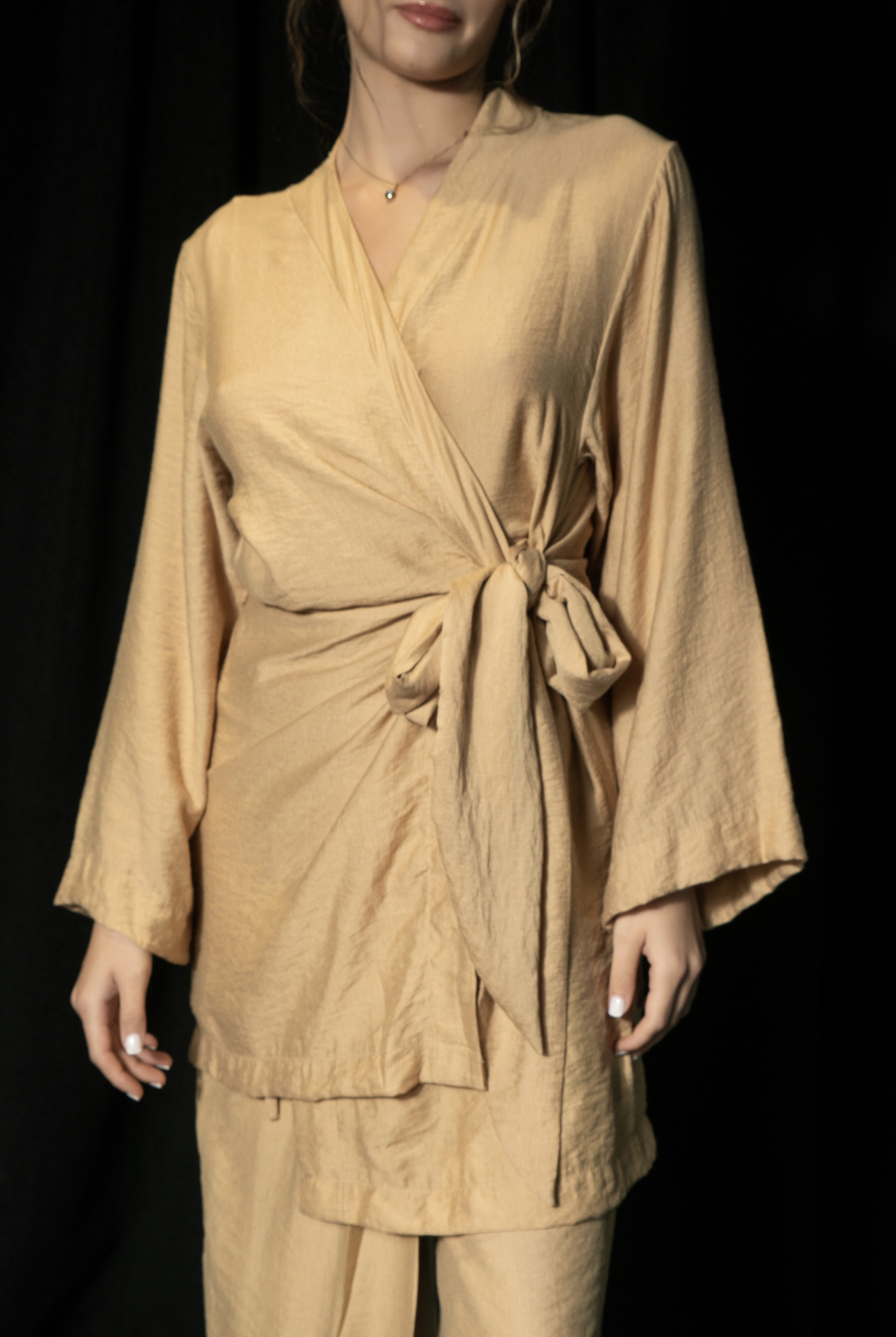 لوزة من الكتان الكاكي بأكمام طويلة | بنطلون طويل مع قص نصف تنورة. الأحجام المتوفرة: S ، M ، L